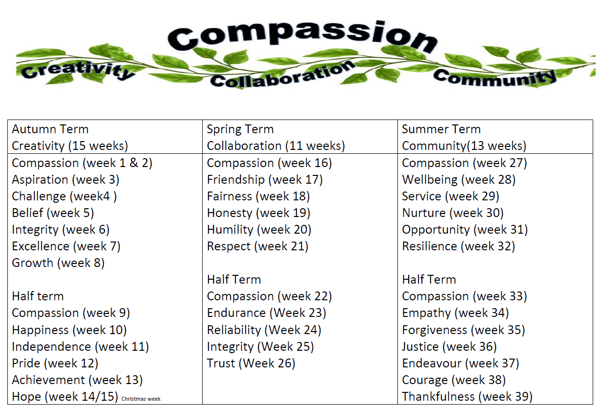 On a Monday, we hold a Values' assembly to introduce and inspire the children at the start of the week. The value is discussed that enabling all children to understand what they will be focussing on and learning throughout the week embodies this. We reinforce this value in our Wednesday assembly where the children are asked how they have been working on the value.